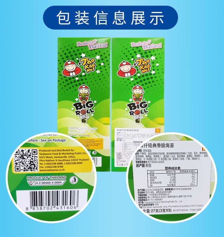 5月泰国进口老板仔海苔卷27g盒香脆紫菜原味脆海苔儿童食品 现10