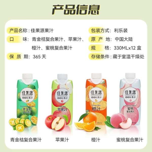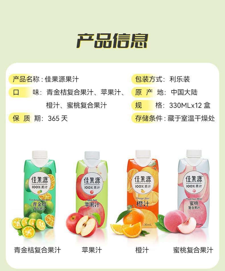 佳果源100%果汁饮料鲜榨橙汁苹果靑桔蜜桃汁椰子水330ml果汁饮料