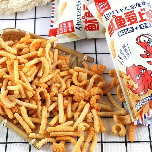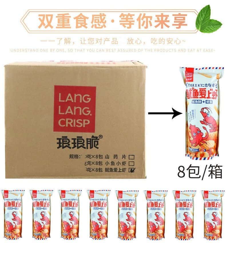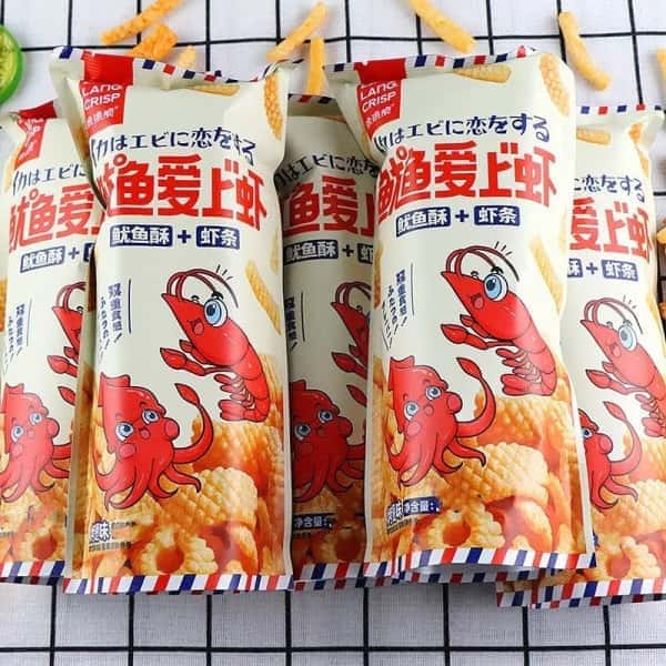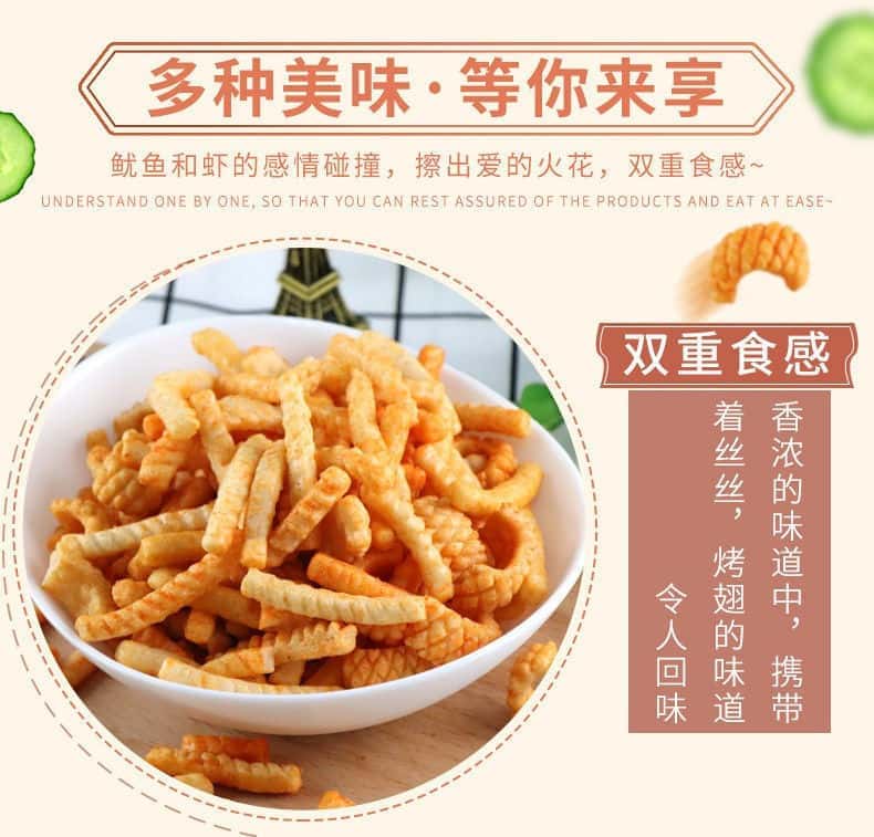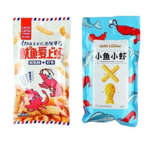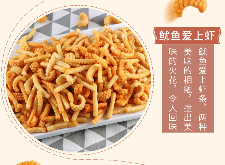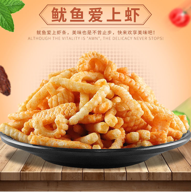 网红琅琅脆鱿鱼爱上虾小鱼小虾虾条薯条片休闲膨化小零食整箱批发